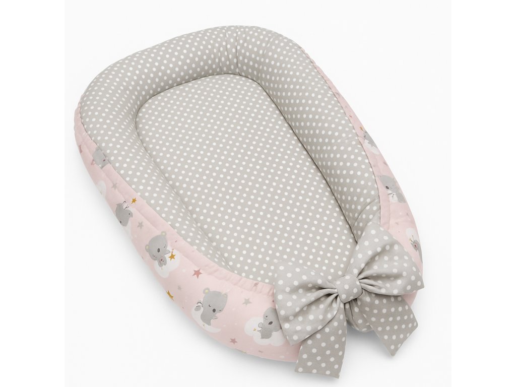 Roztomilé hnízdečko s motivem spících kočiček, měsíčků, obláčků a hvězdiček na růžovém podkladu vytváří klidné a útulné místo pro miminko. Vnitřní část tvoří šedá látka s bílými puntíky, která působí jemně a harmonicky.