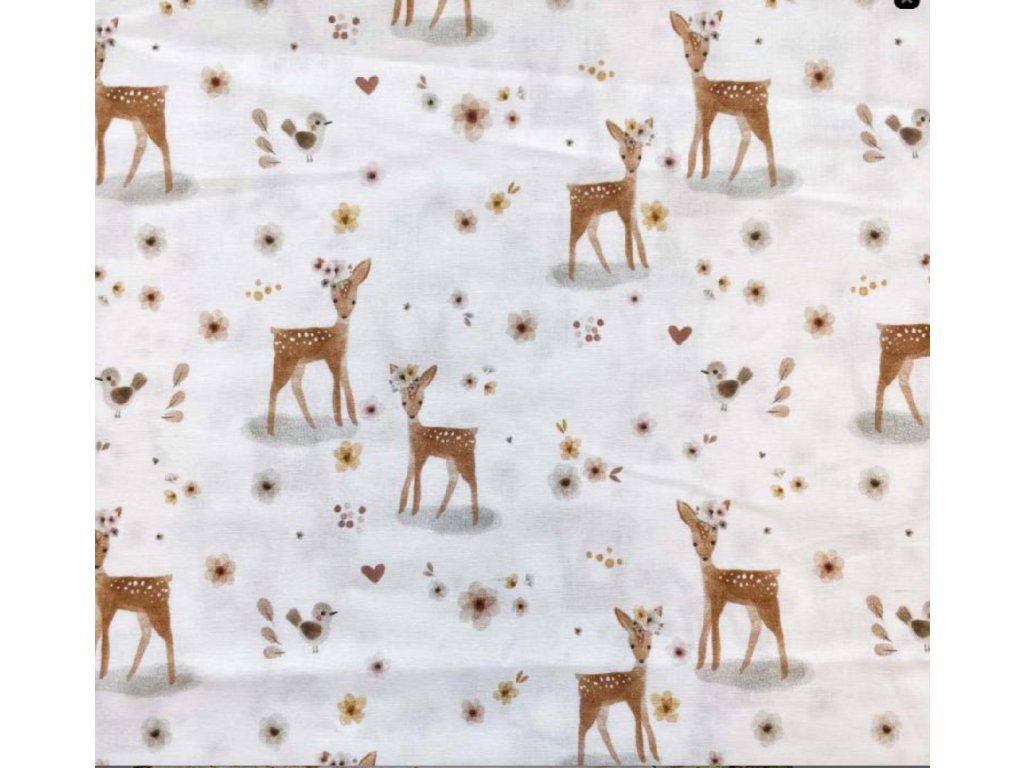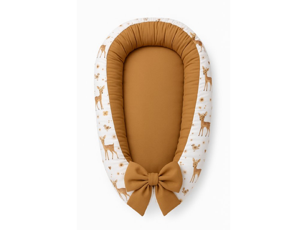 Krásné hnízdečko s jemným vzorem srnek, ptáčků a květin na bílém podkladu přináší miminku pocit klidu a bezpečí.