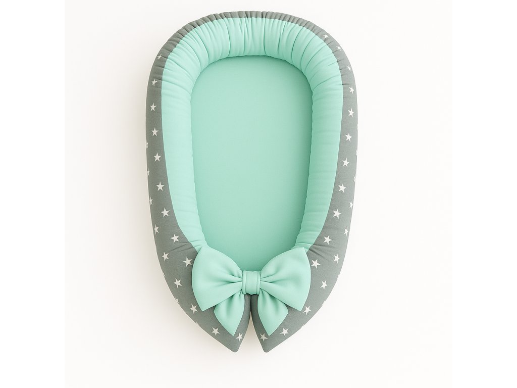 Jemné hnízdečko v mentolových tónech s bílými hvězdičkami působí svěže a moderně.