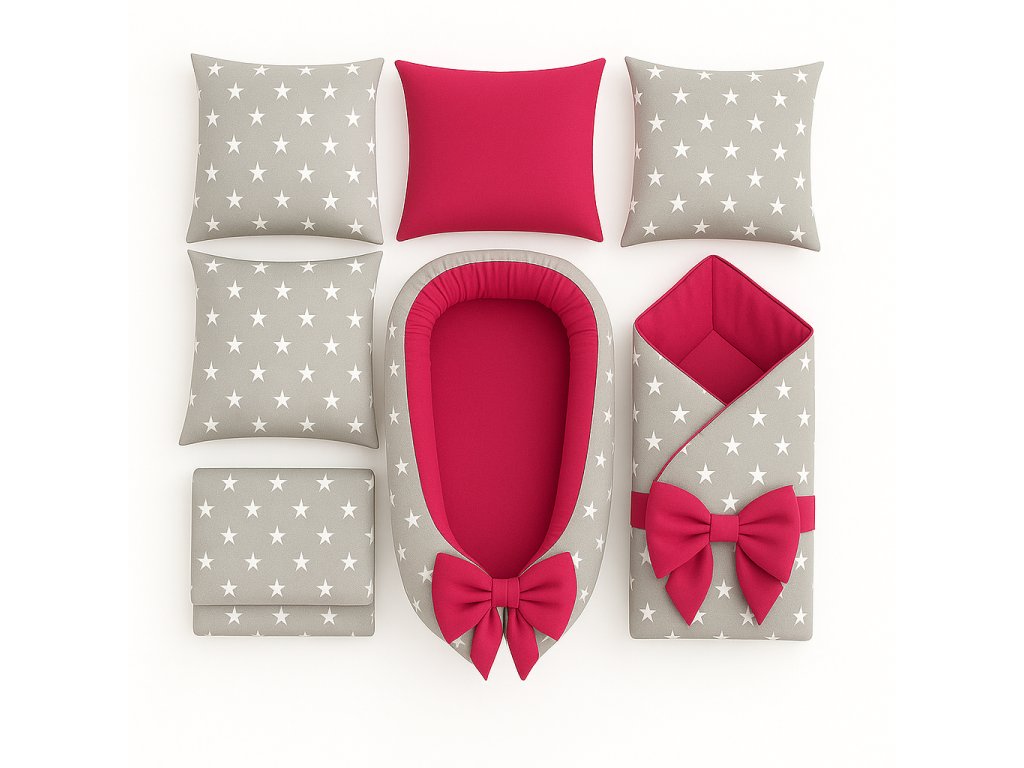 Sytá fuchsiová látka s bílými hvězdičkami dodává celé výbavičce energii a radost. Fuchsiové mašličky 🎀 a ruční šití v ČRzaručují nejen originální vzhled, ale také pohodlí a kvalitu pro vaši malou princeznu.