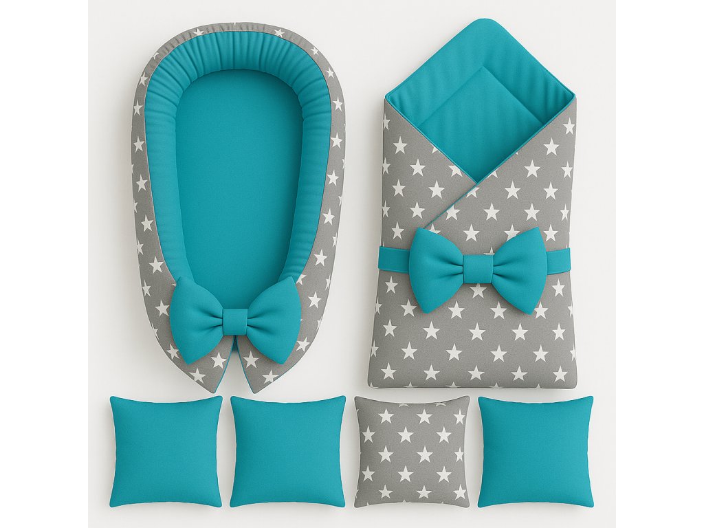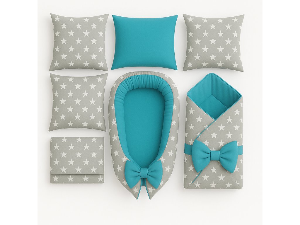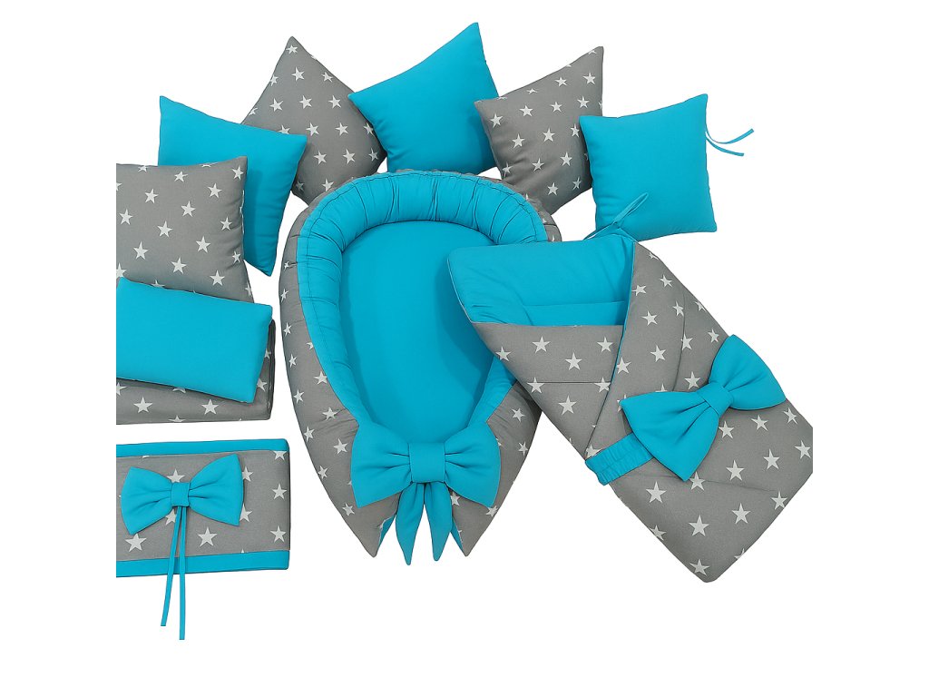 Sada Stars Blue XL obsahuje vše, co potřebujete pro útulnou postýlku – hnízdečko, zavinovačku, mantinel z polštářků, povlečení, prostěradlo a nebesa.