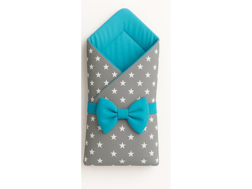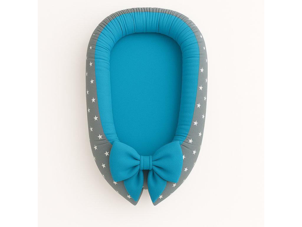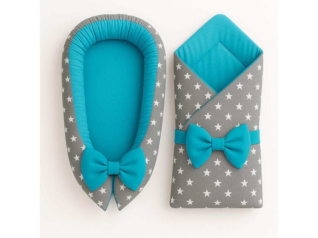 Jemná modrá látka s bílými hvězdičkami působí klidně a čistě. Barevně sladěná nebesa, 🎀 modré mašličky a ruční šití v ČR dodávají celé výbavičce pohodlí, styl a kvalitu už od narození.