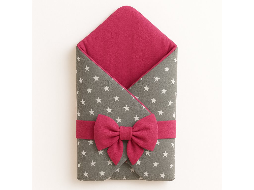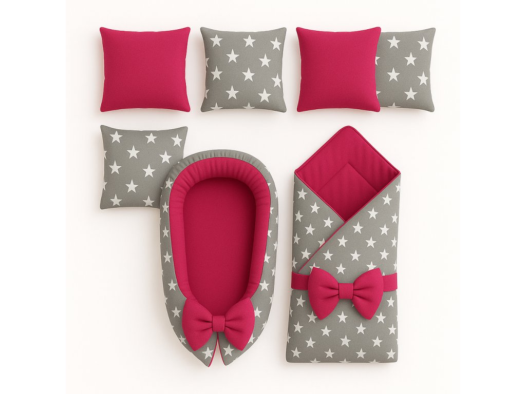 Výrazná fuchsiová barva s bílými hvězdičkami dodává výbavičce energii i něhu. Barevně laděná nebesa, 🎀 fuchsiové mašličky a ruční šití v ČR zajišťují nejen styl, ale i maximální pohodlí pro miminko.