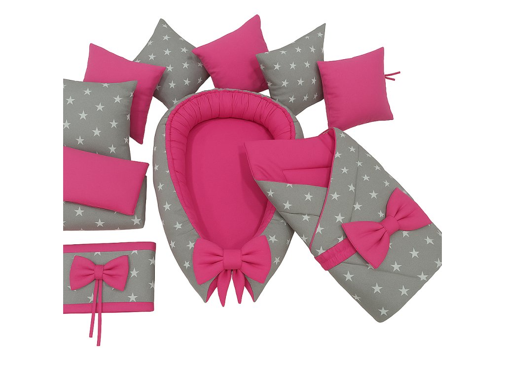 Sada Stars Fuchsie XL obsahuje kompletní výbavu pro krásně sladěnou postýlku – hnízdečko, zavinovačku, mantinel z polštářků, povlečení, prostěradlo a nebesa.