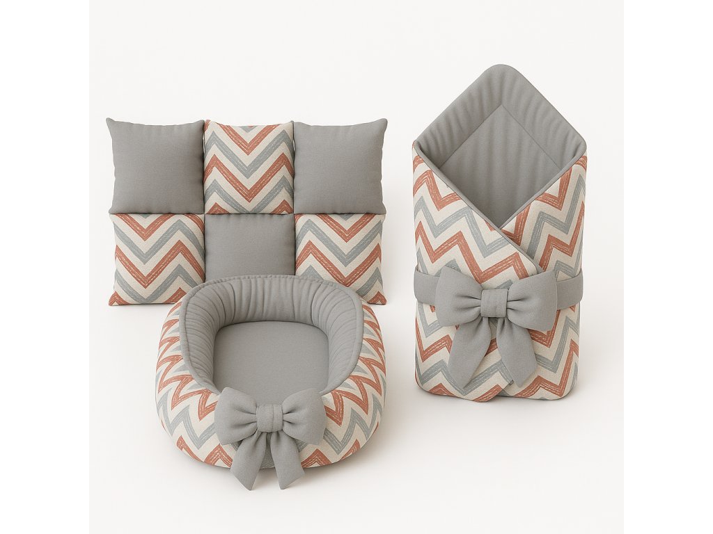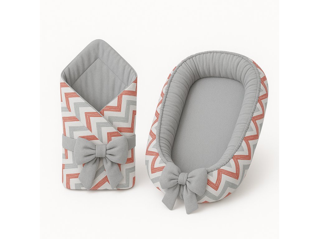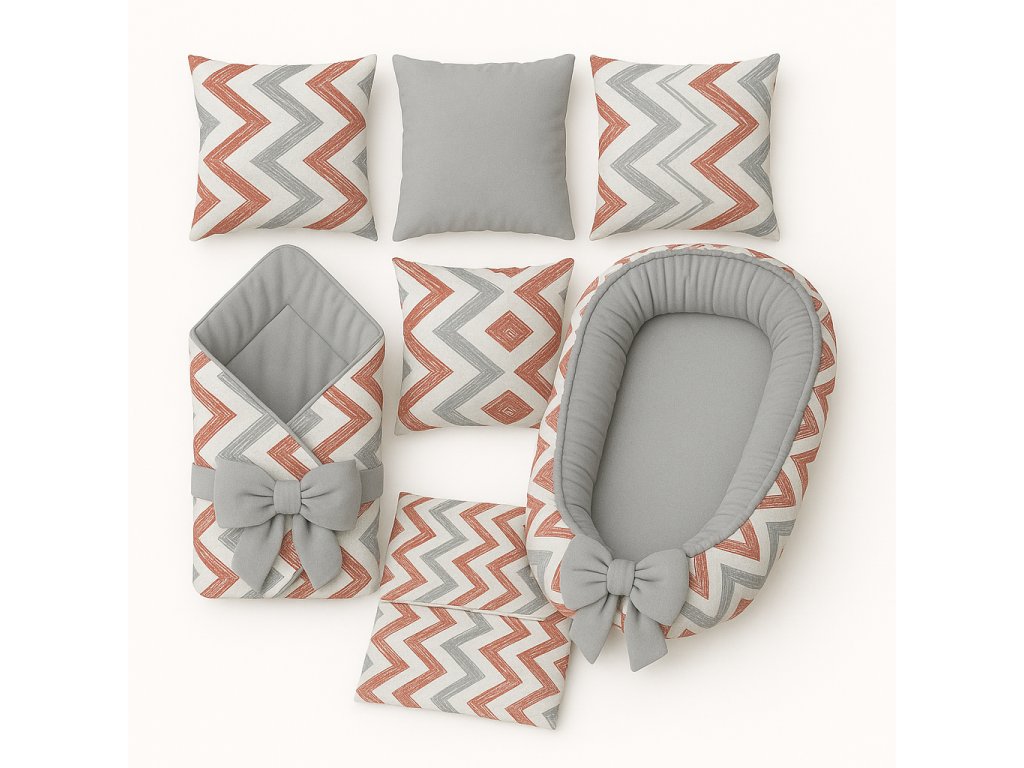 Výrazný červeno-bílý cikcak vzor oživí každý interiér, zatímco světle šedý vnitřek přináší klid a rovnováhu. Šedé mašličky 🎀 a precizní ruční šití v ČR zajišťují kvalitu, styl i pohodlí pro vaše miminko.