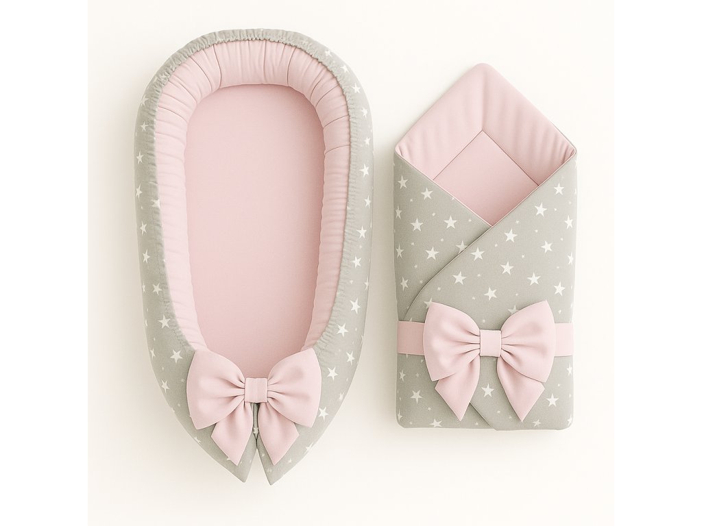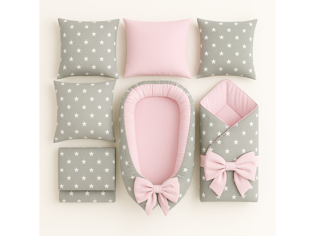 Něžná růžová v kombinaci se šedou látkou s bílými hvězdičkami tvoří kouzelnou výbavičku pro miminko, ideální pro malou princeznu 👶💖