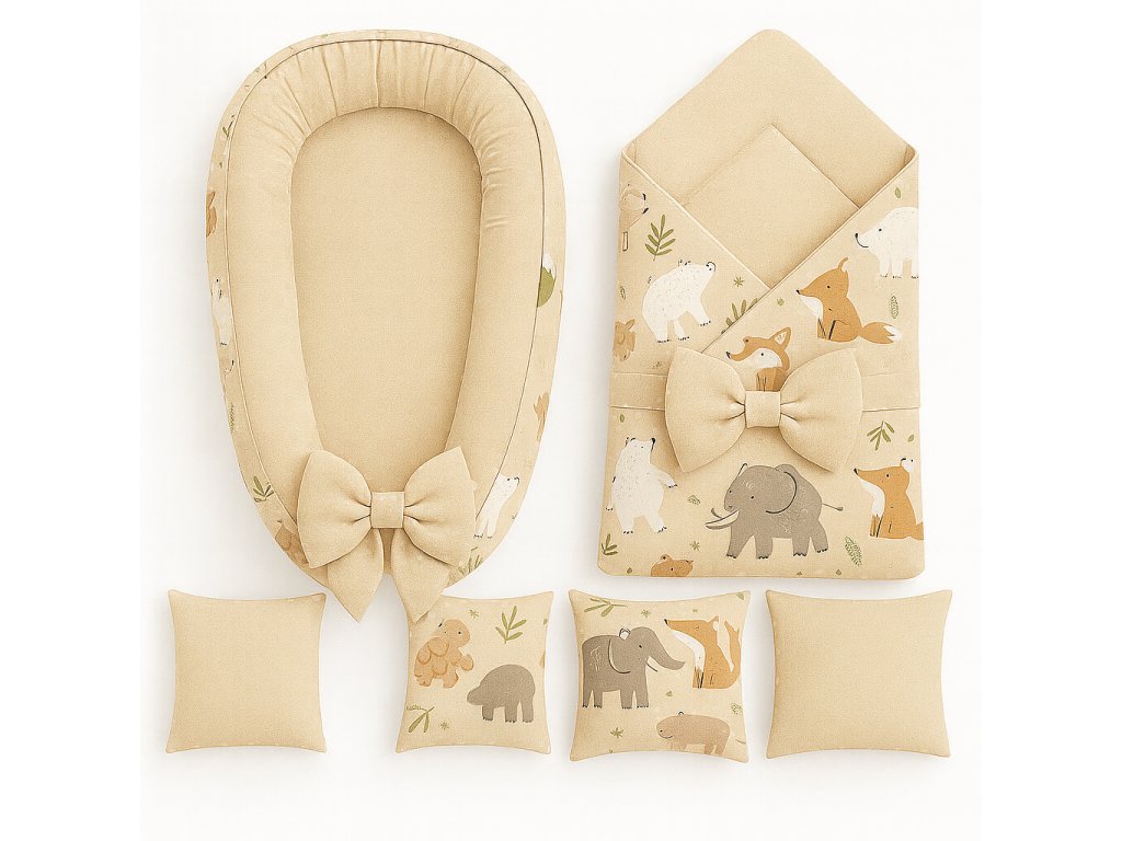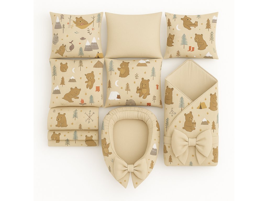 Měkké a hřejivé béžovo-hnědé provedení doplněné o veselé ilustrace medvídků vytváří dokonalou atmosféru bezpečí. 🐻💕 Díky preciznímu ručnímu šití je každá část výbavičky nejen praktická, ale také originální ozdobou postýlky.
