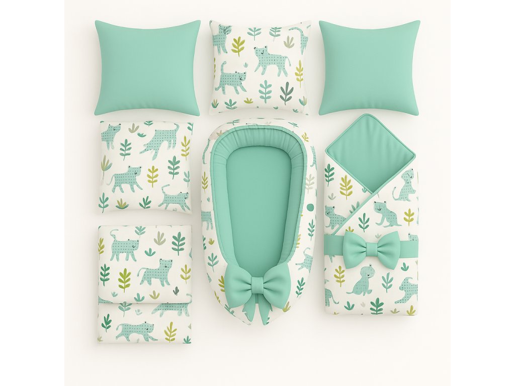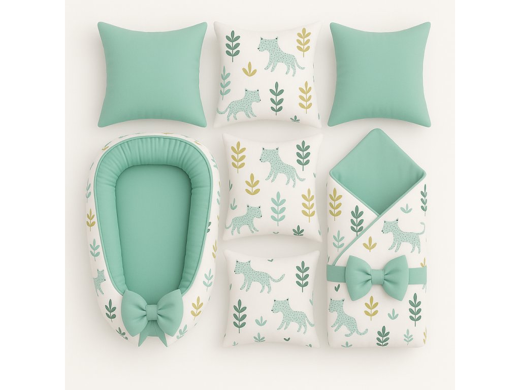 Vydejte se s miminkem do kouzelné džungle plné roztomilých šelem a zelených lístků, která přináší do pokojíčku svěžest a hravost. 🌿🐆 Jemná kombinace mintové barvy a přírodních motivů vytváří moderní a originální vzhled, který si zamilují holčičky i chlapečci. 💚