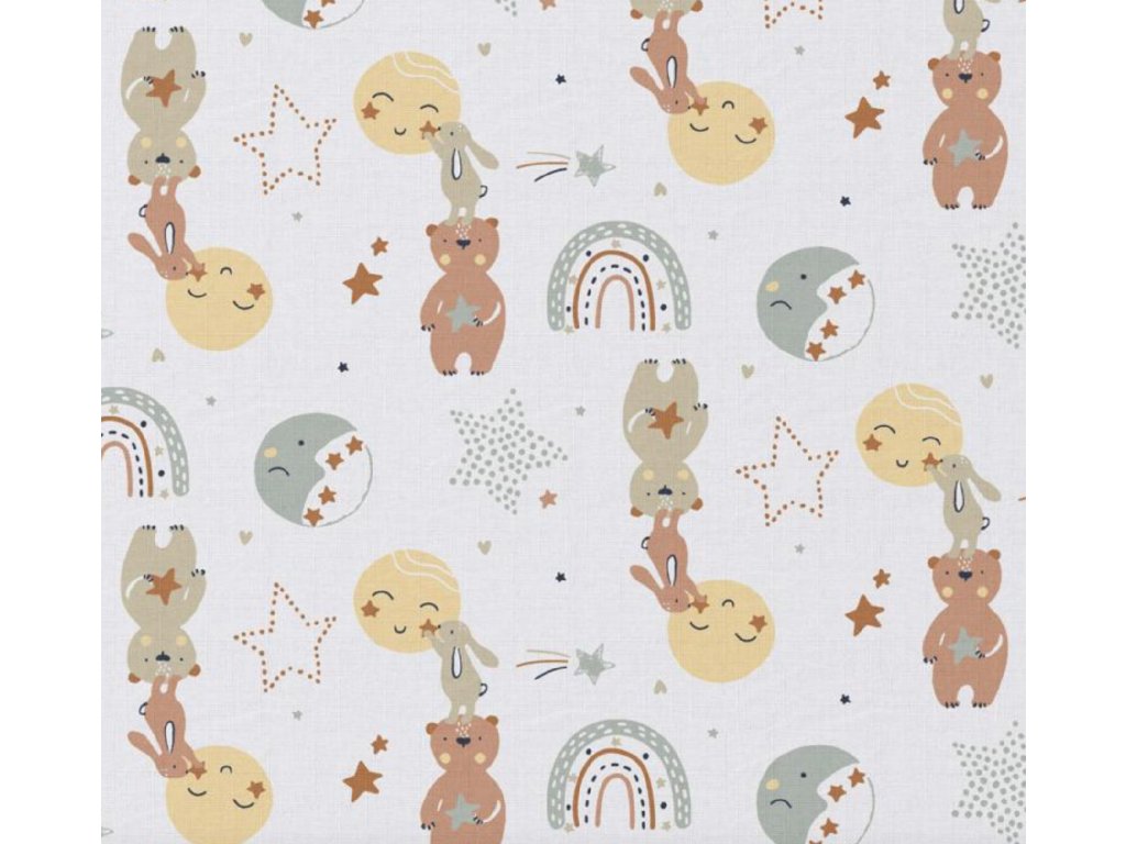 Rozzářete dětský pokojíček motivy sluníček, duhy, zajíčků a medvídků, které přinášejí radost, hravost a klidnou atmosféru. 🌞🌈🐇🐻 Jemná kombinace béžových tónů s puntíky působí útulně a univerzálně – ideální jak pro holčičky, tak pro chlapečky. ✨