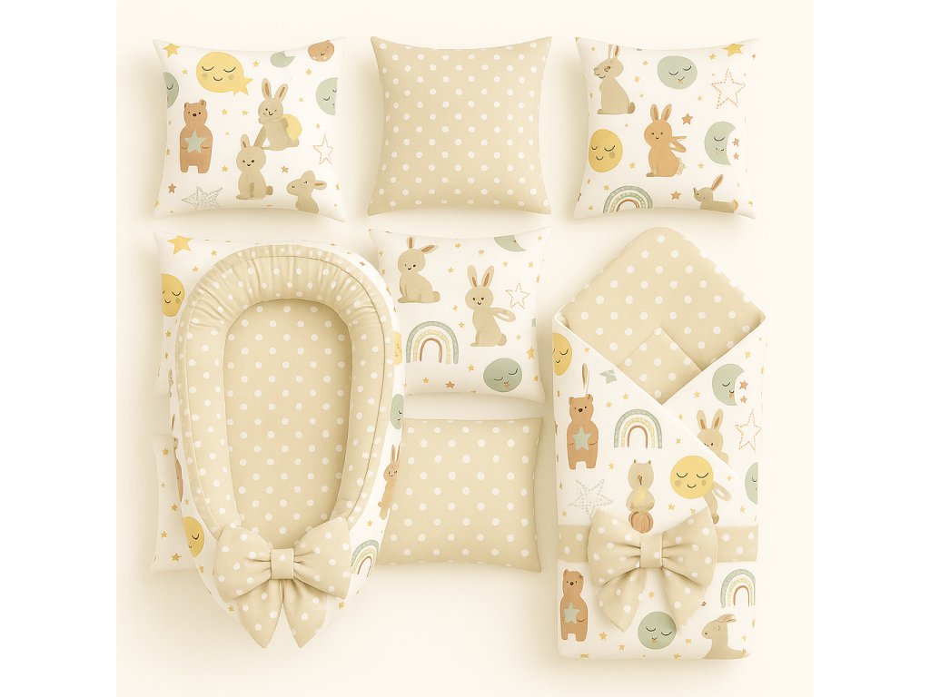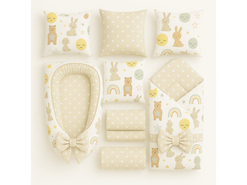 Měkké a hebké materiály spolu s pečlivým ručním šitím zajistí vašemu miminku bezpečí, pohodlí a pocit lásky už od prvních dnů. 🤍 Díky originálním motivům se sada stane nejen praktickým pomocníkem, ale i krásnou ozdobou postýlky.