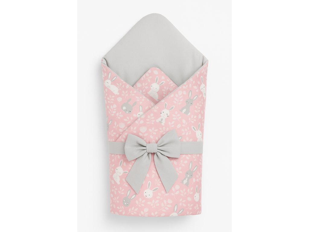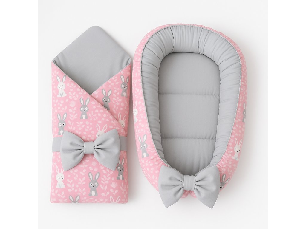 Sada Bunny Girl Mini obsahuje hnízdečko a zavinovačku s roztomilým vzorem králíčků na bílém podkladu.
