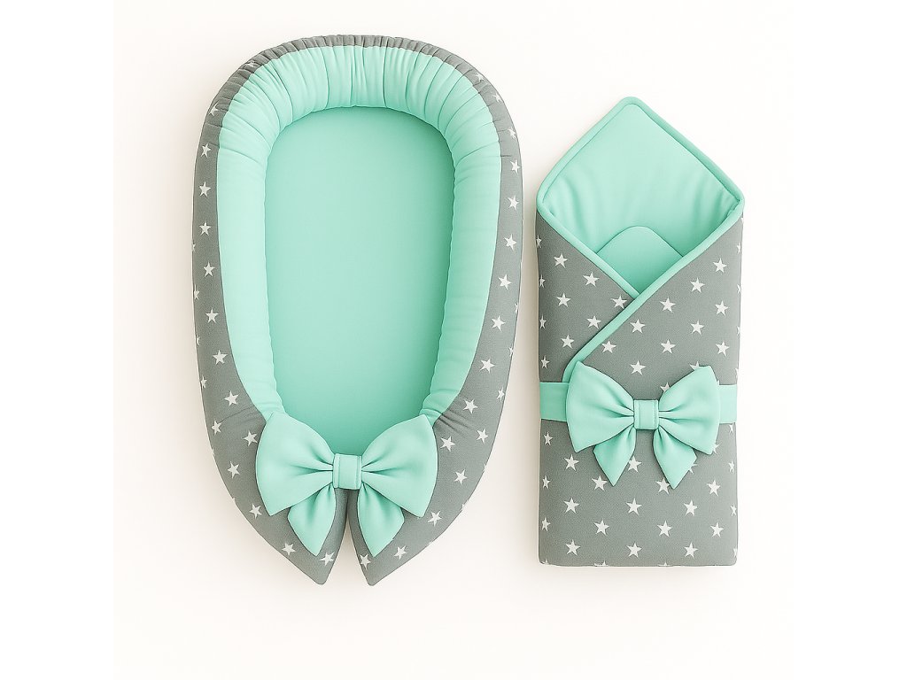 Sada Stars Mentol Mini obsahuje hnízdečko a zavinovačku v jemné mentolové barvě s bílými hvězdičkami. Vnitřní část je z ladící mentolové látky, která působí čistě a klidně.