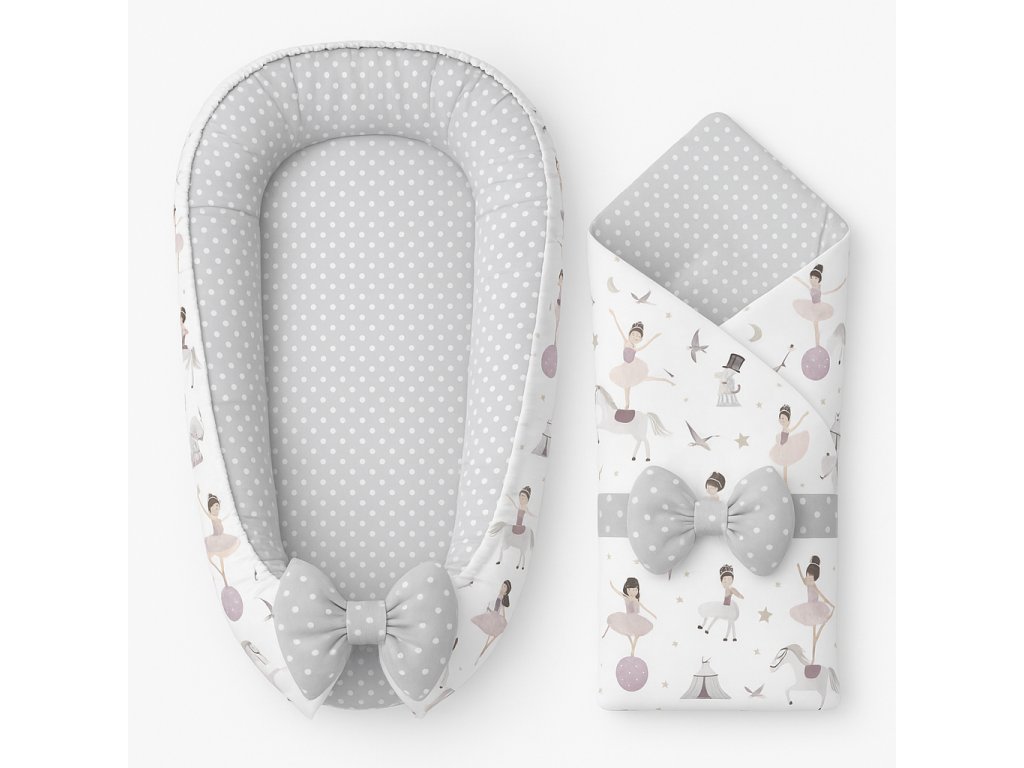 Sada Mini Circus Dream zahrnuje hnízdečko a zavinovačku s okouzlujícím motivem baletek, zvířátek a akrobatek na bílém podkladu.
