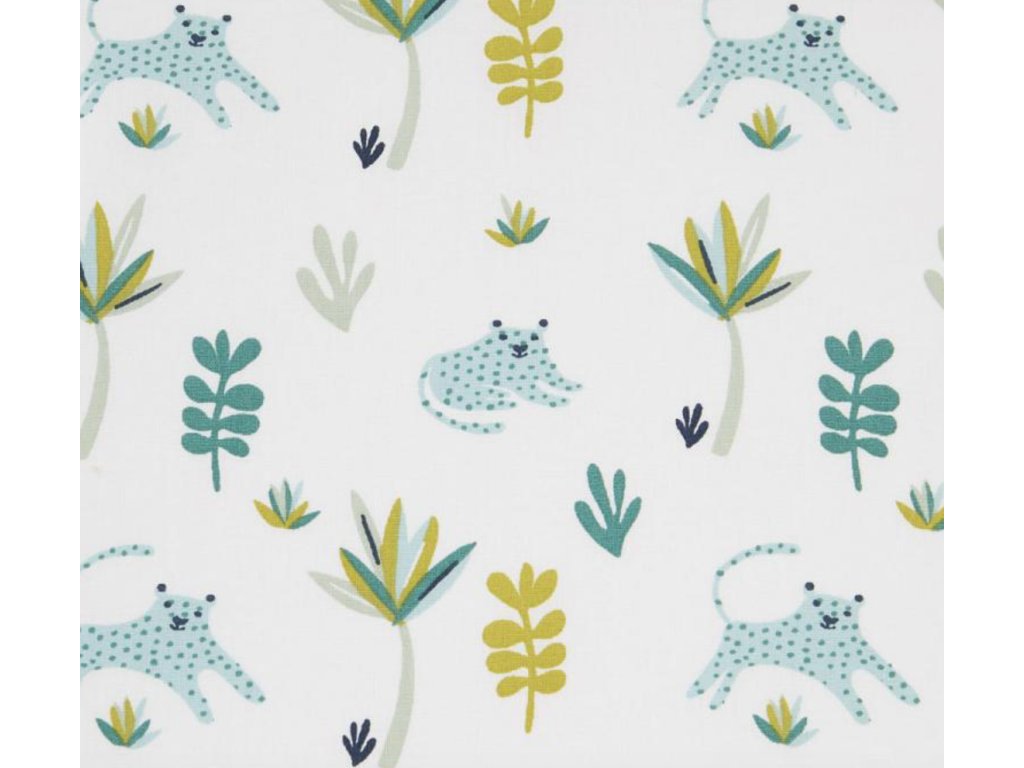 Sada Mini Jungle Mint zahrnuje hnízdečko a zavinovačku s výrazným motivem tyrkysových panterů mezi listy na bílém podkladu.
