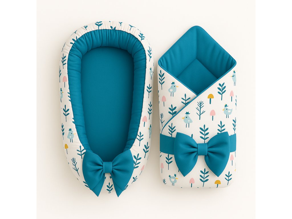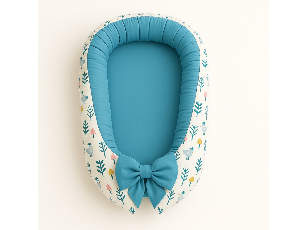 Vzor s ptáčky, stromy a houbami na bílém podkladu navozuje jemnou a hravou atmosféru. Celý vnitřek je z uklidňující modré látky, včetně kulatých mašliček ve stylu BabyTýpka 🎀. Výbavička je ručně šitá v ČR z kvalitní 100% bavlny pro maximální pohodlí a styl.