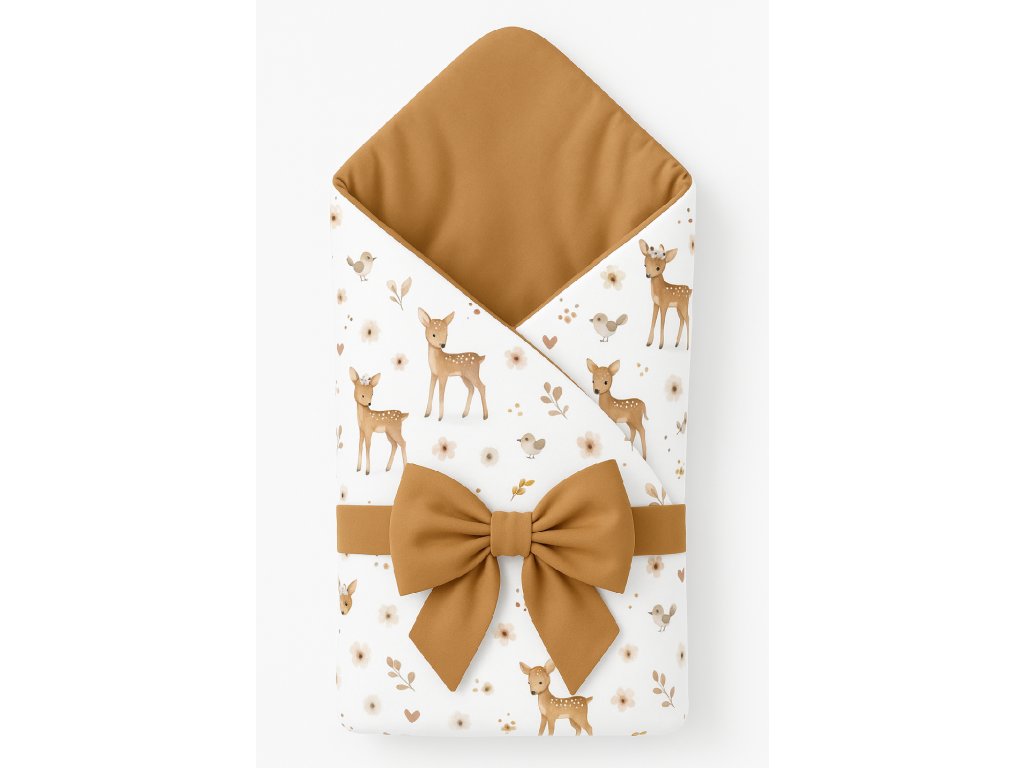 Nádherná zavinovačka s jemným vzorem srnek, ptáčků a květin na bílém podkladu. Uvnitř příjemná jednobarevná hnědá látka, která dodává pocit bezpečí a tepla.